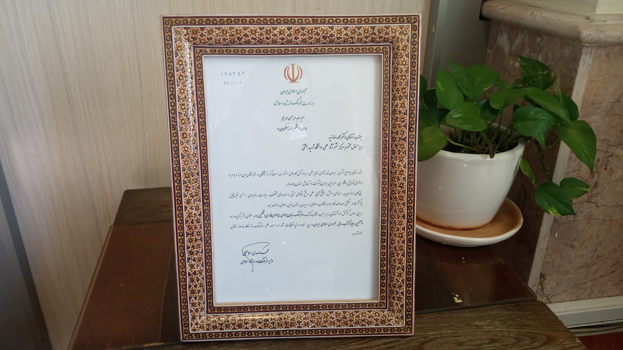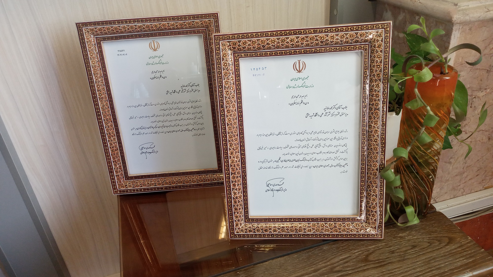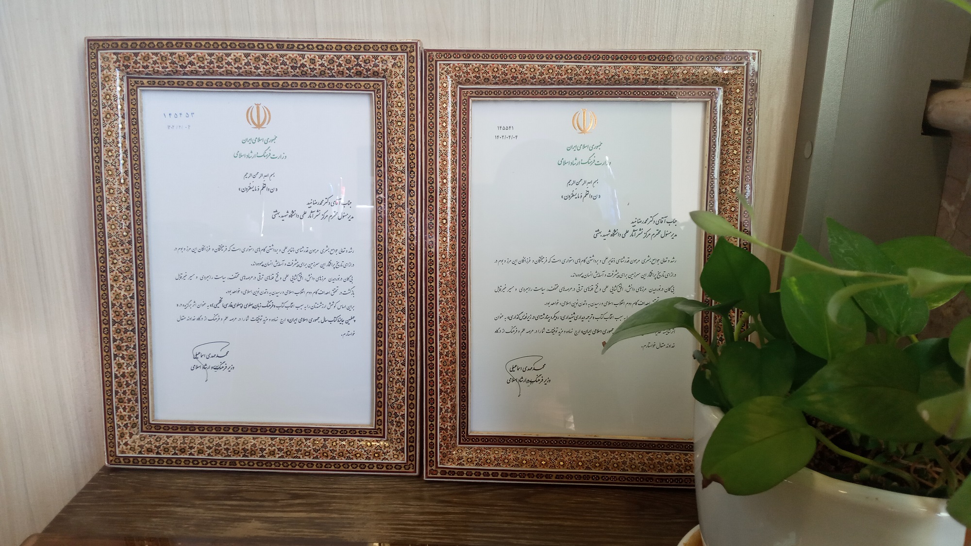 با عنایت به انتخاب دو عنوان از کتاب‌های چاپ‌شده در مرکز نشر آثار علمی دانشگاه 1-کتاب «فرهنگ زبان پهلوی» تالیف جناب آقای دکتر یدالله منصوری به‌عنوان کتاب برگزیده و 2-کتاب «ترجمه دیداری شنیداری: رویکرد بینارشته‌ای در زیرنویس‌گذاری» ترجمه جناب آقای دکتر دانیال بسنج و سرکار خانم عسل امیرخوانساری به‌عنوان کتاب شایسته تقدیر در چهلمین دوره جایزه کتاب سال جمهوری اسلامی ایران، جناب آقای دکتر محمدمهدی اسماعیلی، وزیر فرهنگ و ارشاد اسلامی از جناب آقای دکتر محمدرضا نبید، مدیر محترم مرکز نشر آثار علمی دانشگاه تقدیر نمودند.
