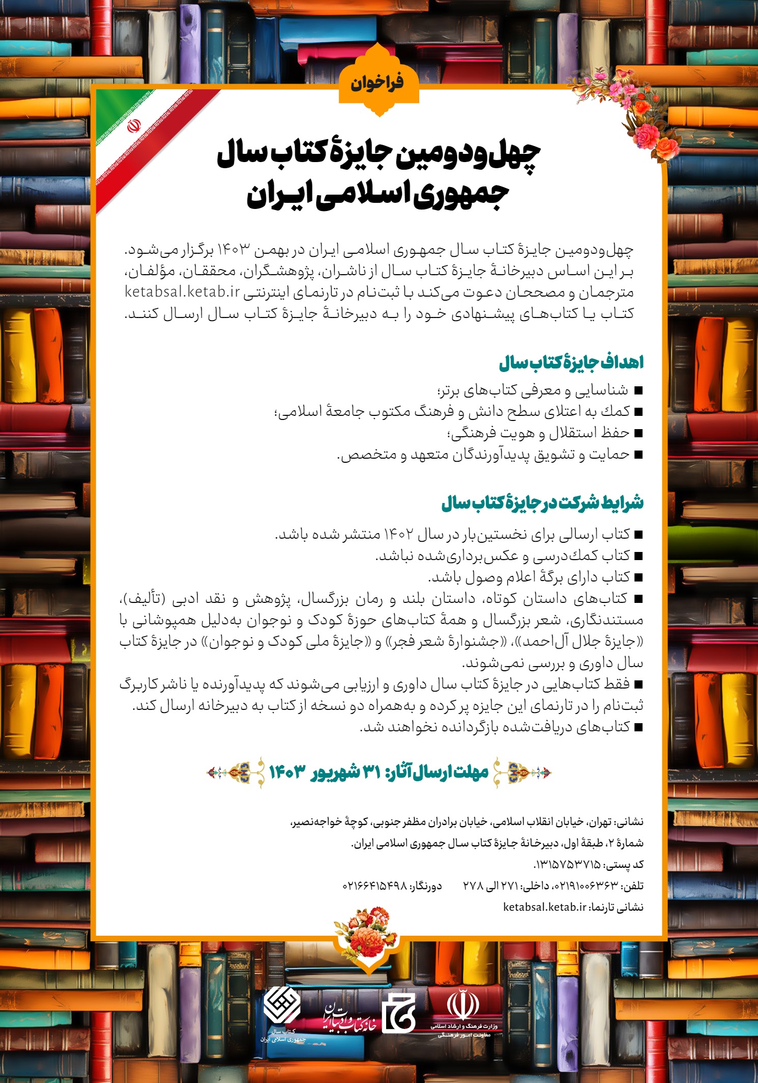 فراخوان چهلودومین جایزه کتاب سال جمهوری اسلامی ایران منتشر شد و مهلت ارسال آثار تا ۳۱ شهریور ۱۴۰۳ است.