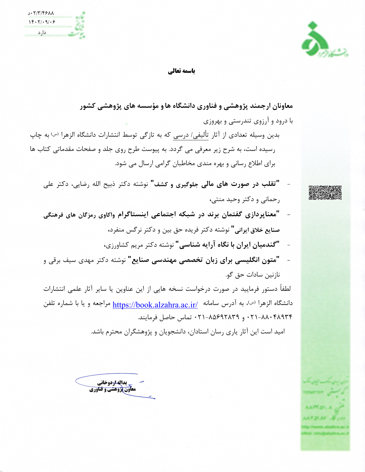 | 17 | الزهرا | معناپردازی گفتمان برند در شبکه اجتماعی اینستاگرام: واکاوی رمزگانهای فرهنگی صنایع خلاق ایرانی | تالیف | دکتر فریده حقبین و دکتر نرگس منفرد | نامه / پیوست |