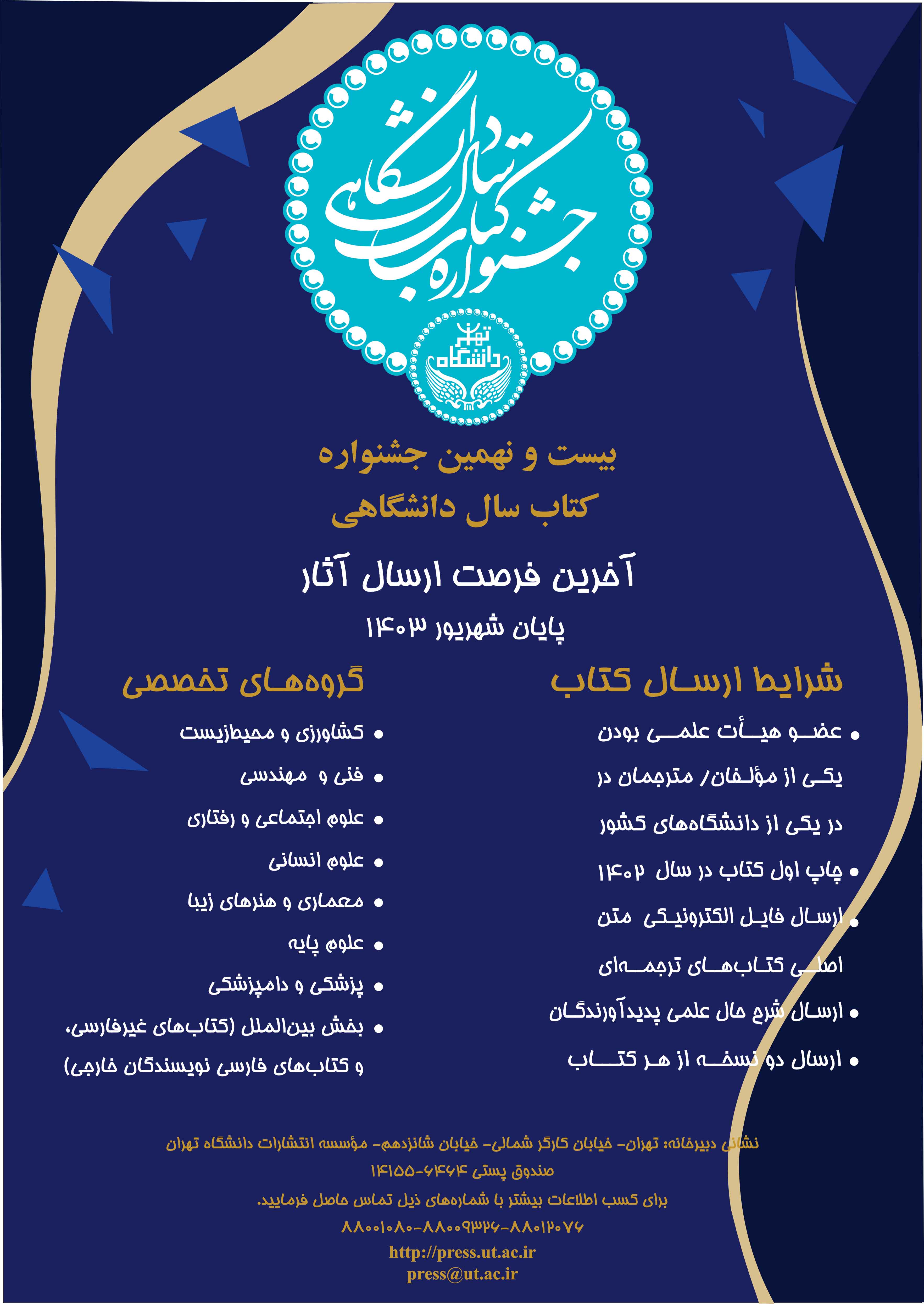 موسسه انتشارات دانشگاه تهران همسو با اهداف علمی و فرهنگی خود همهساله جشنواره کتاب سال دانشگاهی را بهمنظور بررسی کتابهای منتشرشده در حوزه نشر دانشگاهی و ترغیب نویسندگان و مترجمان به تولید آثار فاخر و منابع علمی مورد نیاز جامعه علمی و دانشگاهی کشور برگزار میکند. در سال جاری همت موسسه انتشارات دانشگاه تهران بر آن است که بیست و نهمین دوره این جشنواره را برگزار کند. از این رو از تمامی مولفان و مترجمانی دعوت شده است کتابهای خود که دارای شرایط شرکت در جشنوارهاند، به دبیرخانه جشنواره ارسال کنند. آیین اختتامیه و تقدیر از برگزیدگان همزمان با هفته پژوهش در آذر 1403برگزار خواهد شد.