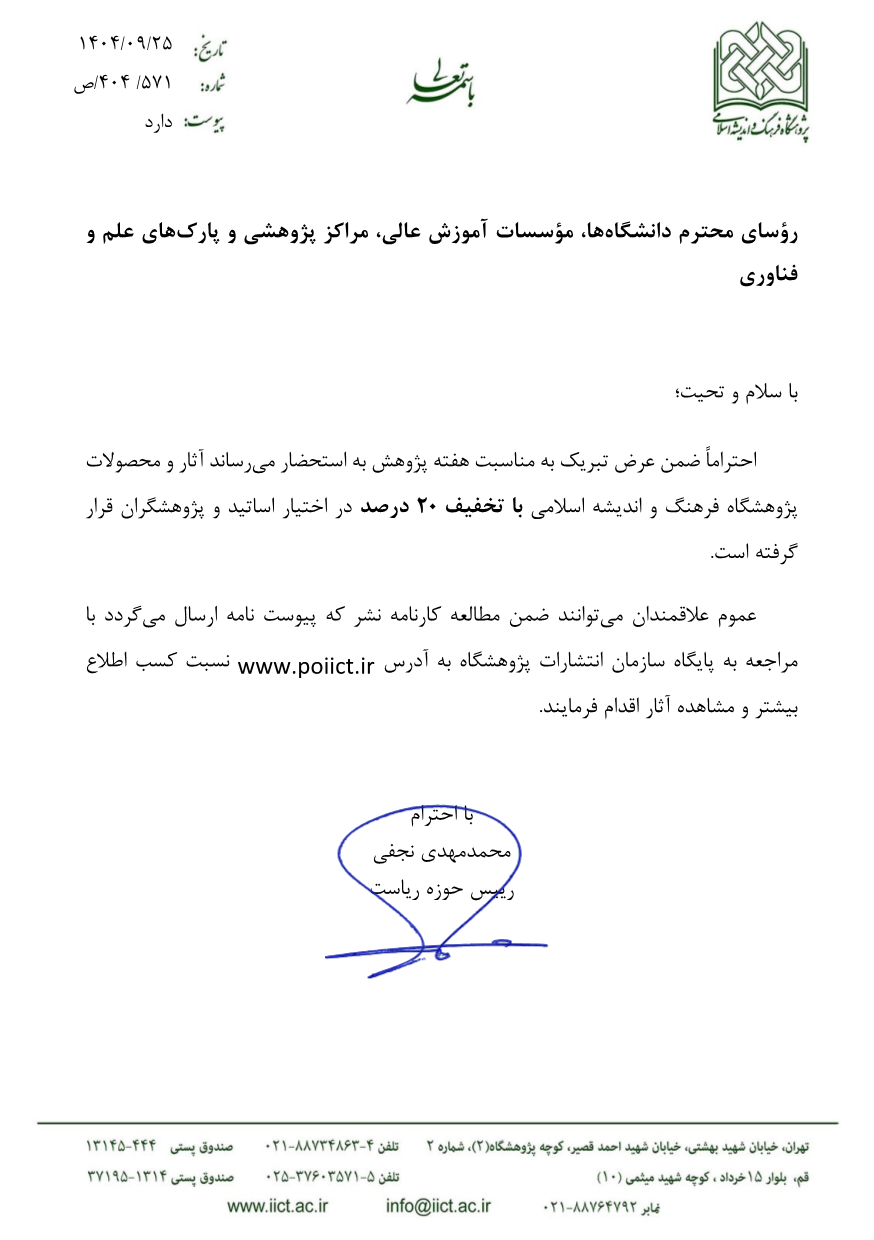 20درصد تخفیف خرید آثار پژوهشگاه فرهنگ و اندیشه اسلامی به مناسبت هفتۀ پژوهش 1404
