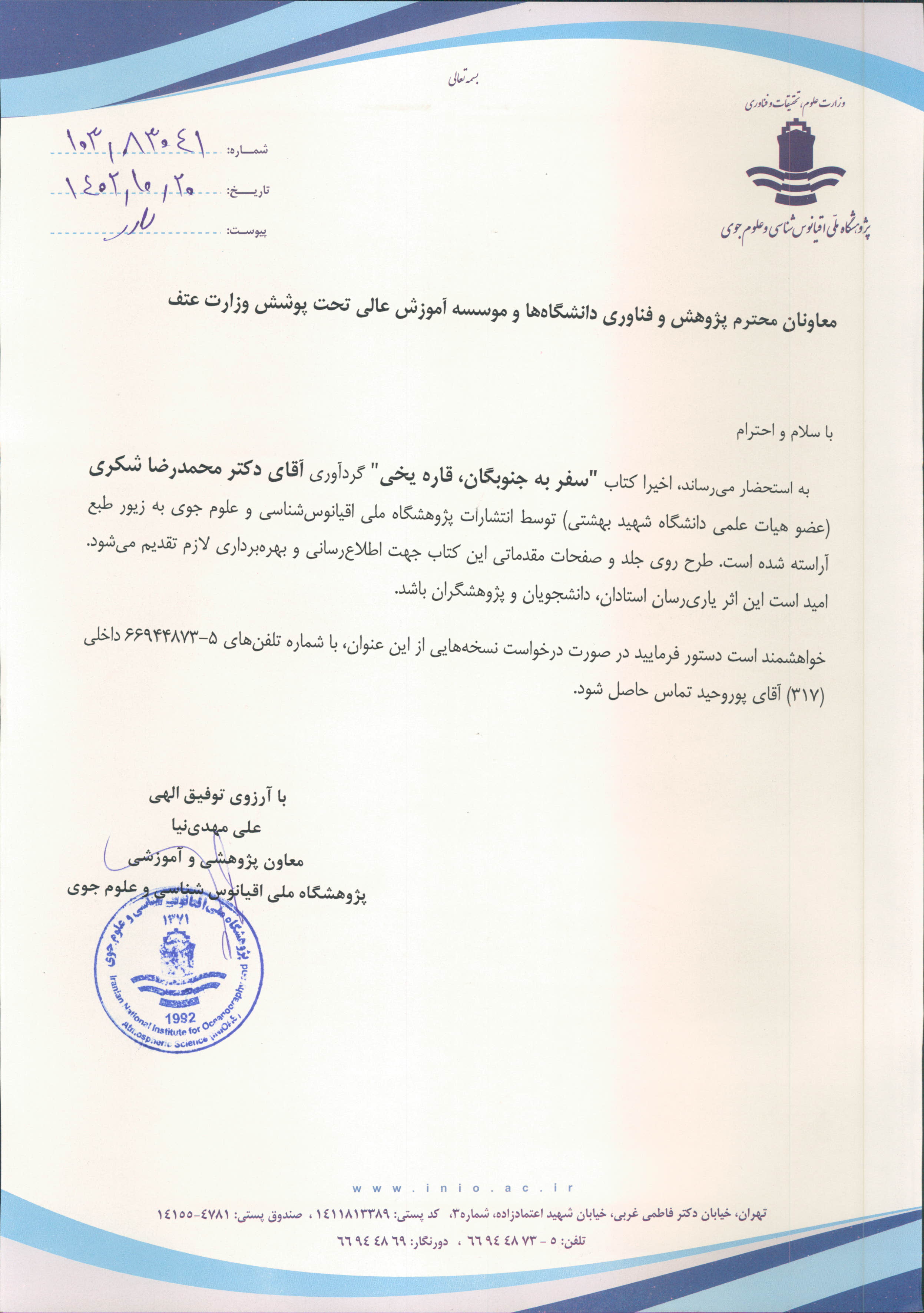 | 32 | پژوهشگاه ملّی اقیانوسشناسی و علوم جوی | سفر به جنوبگان، قارۀ یخی | گردآوری | دکتر محمدرضا شکری | نامه / پیوست |