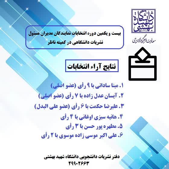 نتایج نهایی بیست و یکمین دوره انتخابات نمایندگان مدیران مسئول نشریات دانشگاهی در کمیته ناظر بر نشریات دانشگاهی