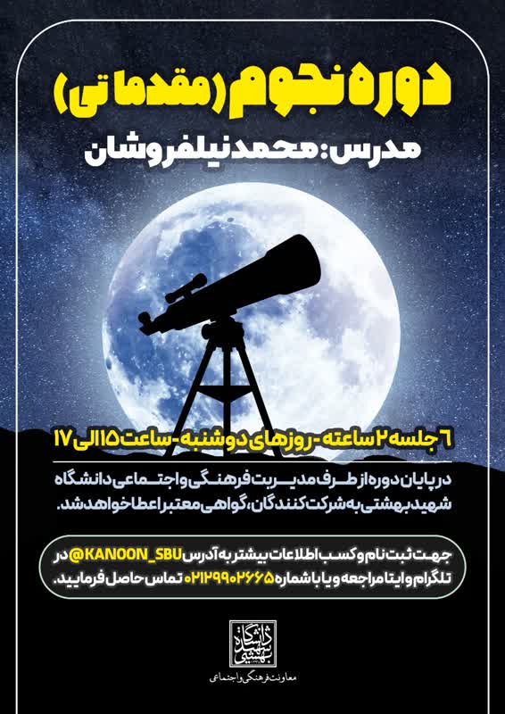 کانون نجوم، دوره نجوم مقدماتی با مدرسی محمد نیلفروشان به مدت ۶ جلسه ۲ ساعته روزهای دوشنبه ساعت ۱۵ در  خانه فرهنگ برگزار می‌کند.