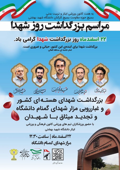 این مراسم به همت کانون ورزشی ایثار و تربیت‌بدنی حوزه مقاومت بسیج کارکنان دانشگاه شهید بهشتی بزرگداشت شهدای هسته‌ای کشور همراه با غبارروبی مزار شهدای گمنام دانشگاه و تجدید میثاق با شهیدان با حضور دانشگاهیان برگزار می شود.