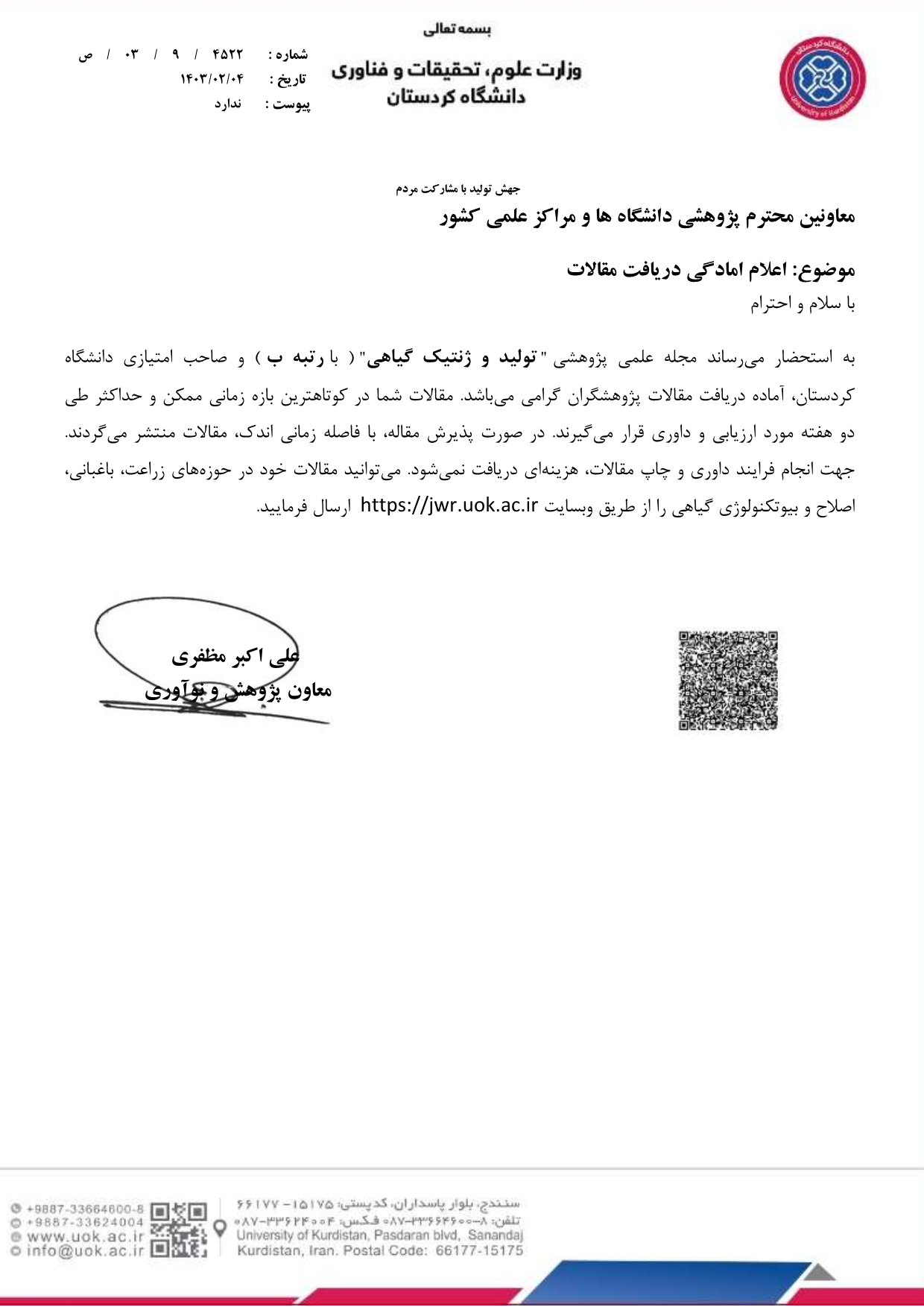 | 1 | کردستان | مجله علمی پژوهشی تولید و ژنتیک گیاهی | فایل |