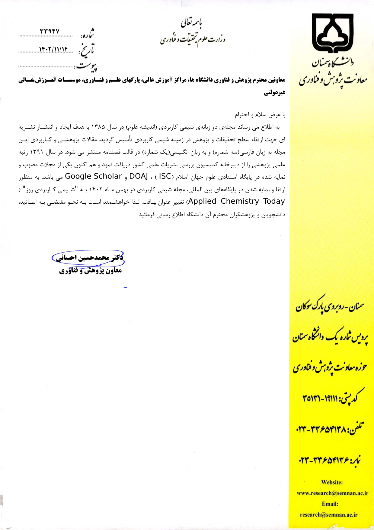 | 19 | رازی | Bioinorganic and Medicinal Inorganic Chemistry Journal