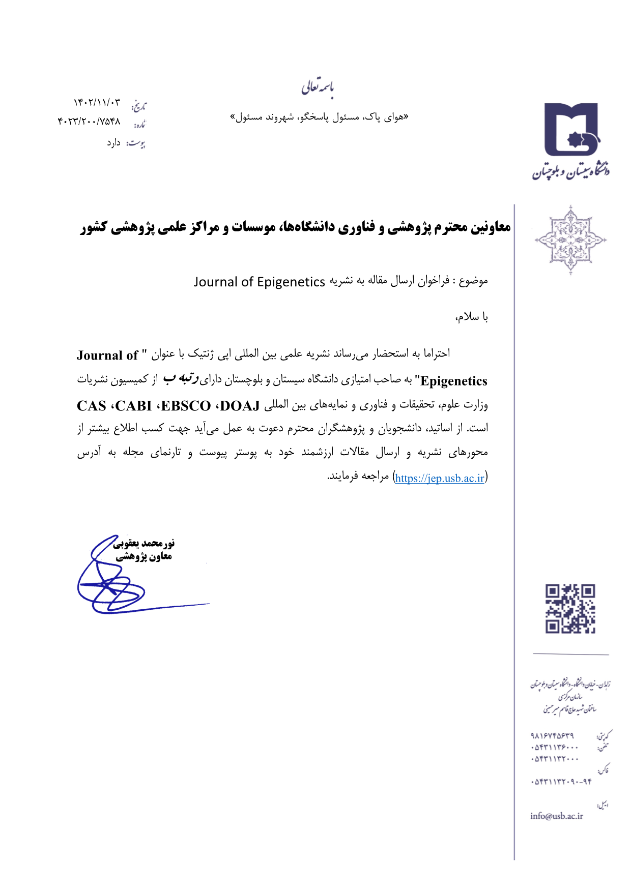 | 30 | سیستان و بلوچستان | نشریه علمی بینالمللی اپی ژنتیک Journal of Epigenetics |