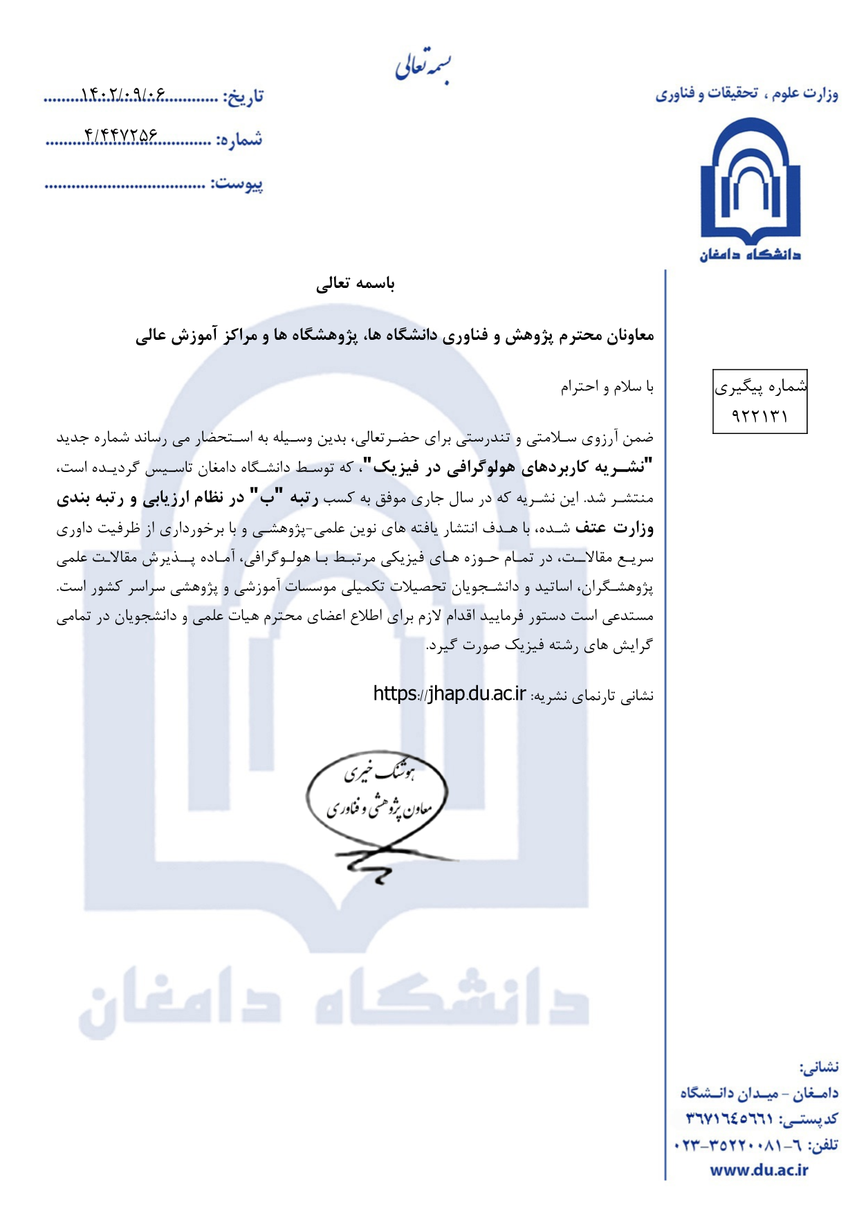 | 47 | دامغان | نشریه کاربردهای هولوگرافی در فیزیک | فایل |